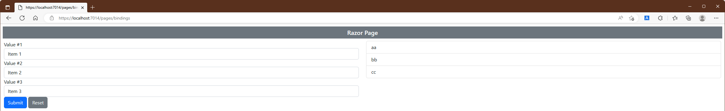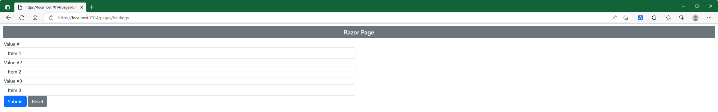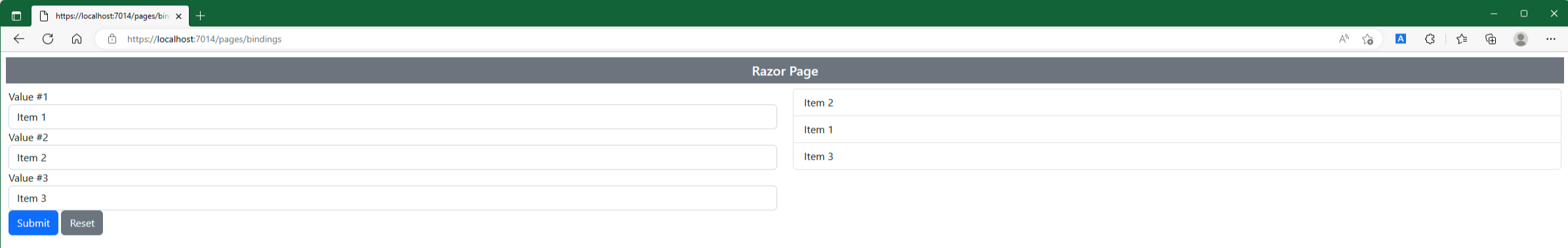 예제에서 Data속성의 type은 SortedSet<string>으로 변경되었습니다. 이에 따라 model binder는 alphabet순으로 정렬될 input요소로 부터의 값을 채우게 될 것입니다. cshtml에서는 여전히 input요소의 name attribute에 index표시가 남아 있기는 하지만 collection class는 alphabet순서로 값을 정렬할 것이기 때문에 큰 의미는 없습니다. project를 실행하고 /pages/bindings URL을 요청한 뒤 field를 채우고 form을 submit 합니다. model binding process는 정렬된 form값을 채우게 되고 다음과 같은 순서로 표현될 것입니다.