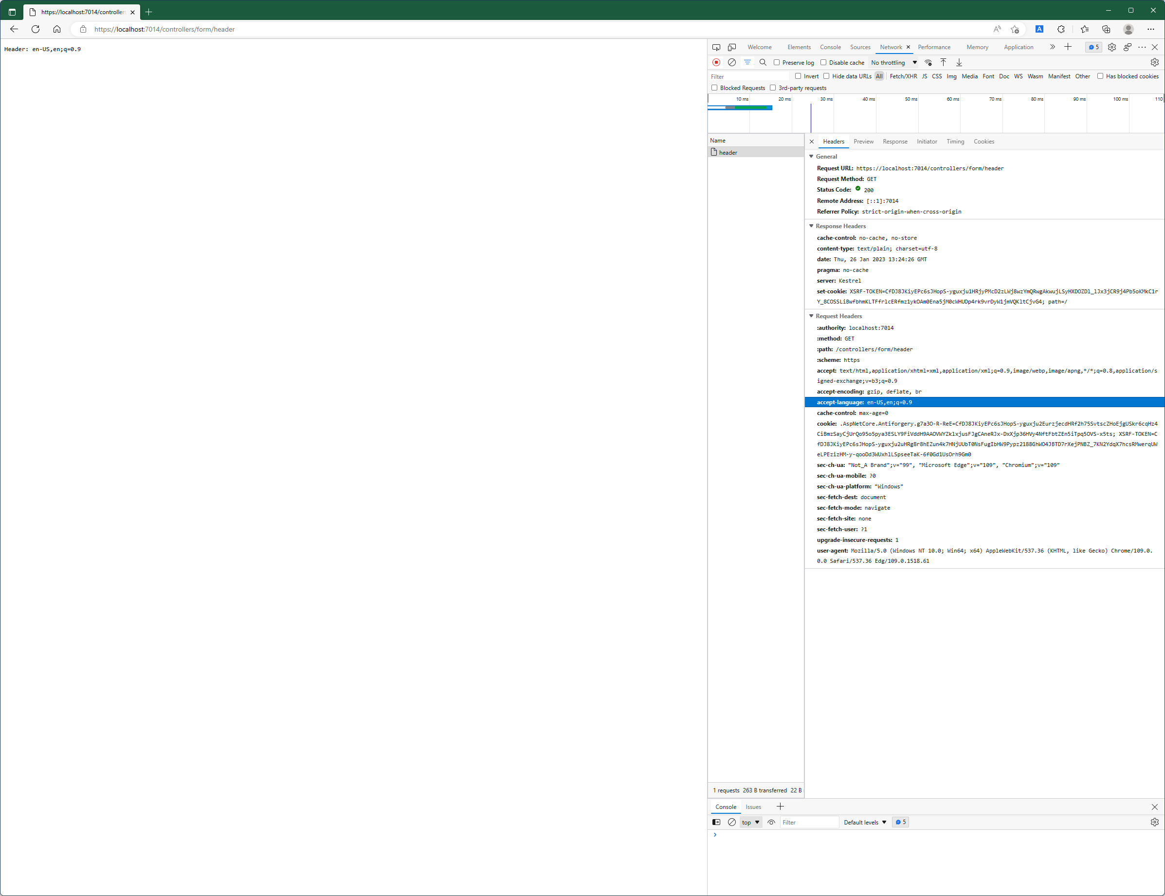 예제에서 사용된 'Accept-Language'명칭은 C#의 매개변수 이름으로서는 사용할 수 없으며 model binder는 자동적으로 AcceptLanguage와 같은 이름을 header와 일치하는 Accept-Language로 변환하지 않습니다. 대신 attribute를 설정하는 Name속성을 사용하여 원하는 header와 일치하도록 하였습니다. project를 실행하고 /controllers/form/header로 URL을 요청하면 다음과 비슷한 결과를 볼 수 있게 됩니다.