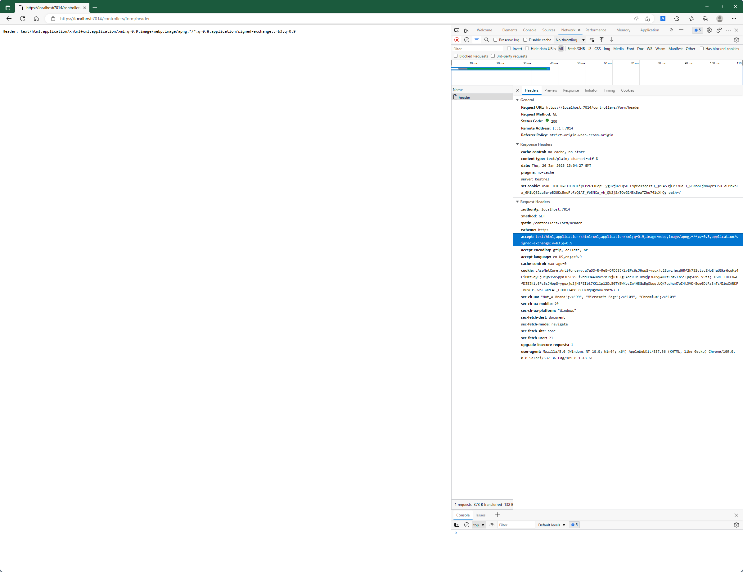 Header action method는 accept라는 매개변수를 정의하고 있는데 해당 값은 현재 요청의 Accept header로 부터 가져오게 될 것이며 다시 method의 결과로써 반환하게 됩니다. project를 실행하여 /controllers/form/header URL을 호출하면 아마도 아래와 비슷한 결과를 보게 될 것입니다.