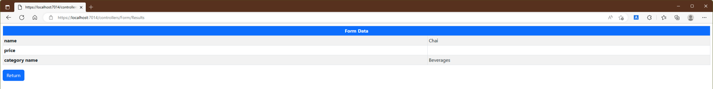 model binding system은 ASP.NET Core가 SubmitForm action method에서 처리될 요청을 받을때 ProductName과 UnitPrice값을 가져오기 위해 사용됩니다. 매개변수의 사용은 action method를 단순화하며 또한 요청 data를 C# data로 변환하는 역할을 수행함으로써 price값은 C#의 action method가 호출되기 전에 decimal type으로 변환될 것입니다.(예제에서는 decimal을 temp data로 저장하기 위해 다시 string로 변환하였습니다.) project를 실행하여 /controllers/form URL을 요청한 뒤 submit button을 click 합니다. 그러면 model binding기능에 의해 요청으로부터 값이 다음과 같이 추출될 것입니다.
