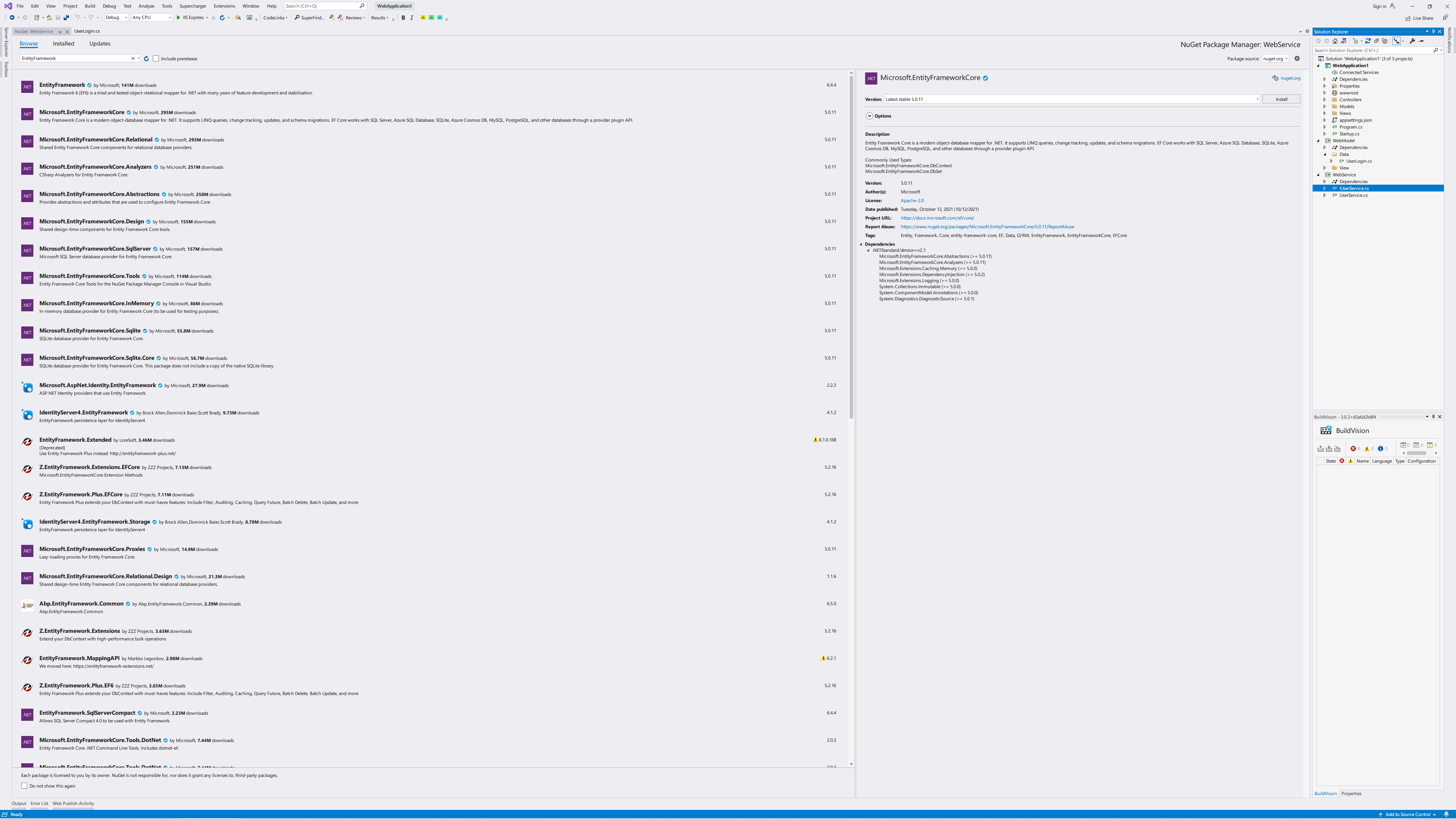 이제 WebService Project로 넘어가 해당 Project에서 NuGet Package를 통해 Micorsoft.EntityFrameworkCore와 Microsoft.EntityFrameworkCore.SqlServer, Microsoft.EntityFrameworkCore.Tools를 설치해 줍니다. 특히 2번째의 경우에는 MS SQL Server를 DB로 사용하는 경우이고 만약 다른 DB Server를 사용한다면 해당 Server에 맞는 package를 설치해야 할 것입니다. 그리고 3번째 package는 나중에 시도해볼 migration작업 시에 사용되는 package입니다.