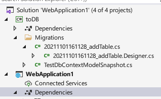 package설치가 완료되었으면 WebService에도 Microsoft.EntityFrameworkCore.Tools를 제외한 동일한 package를 설치합니다. 그리고 project에 DB folder를 생성해 TestDbContext라는 이름의 class를 같이 추가합니다.