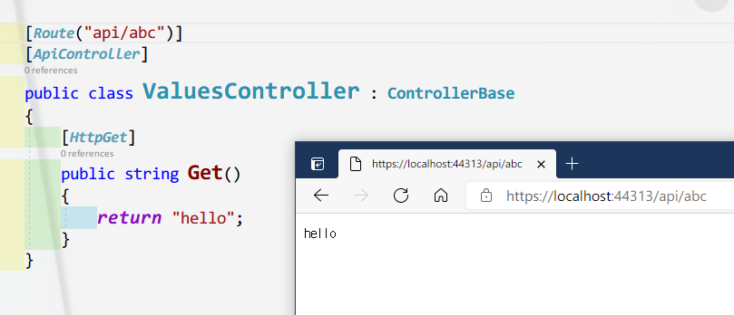 위와 같이 설정된 상태라면 '/api/values/abc'나 '/api/values/123'과 같은 호출이 가능해 지지만 {id} 매개변수가 설정된 액션 메서드가 존재한다면 충돌이 발생할 수 있으므로 주의해야 합니다.