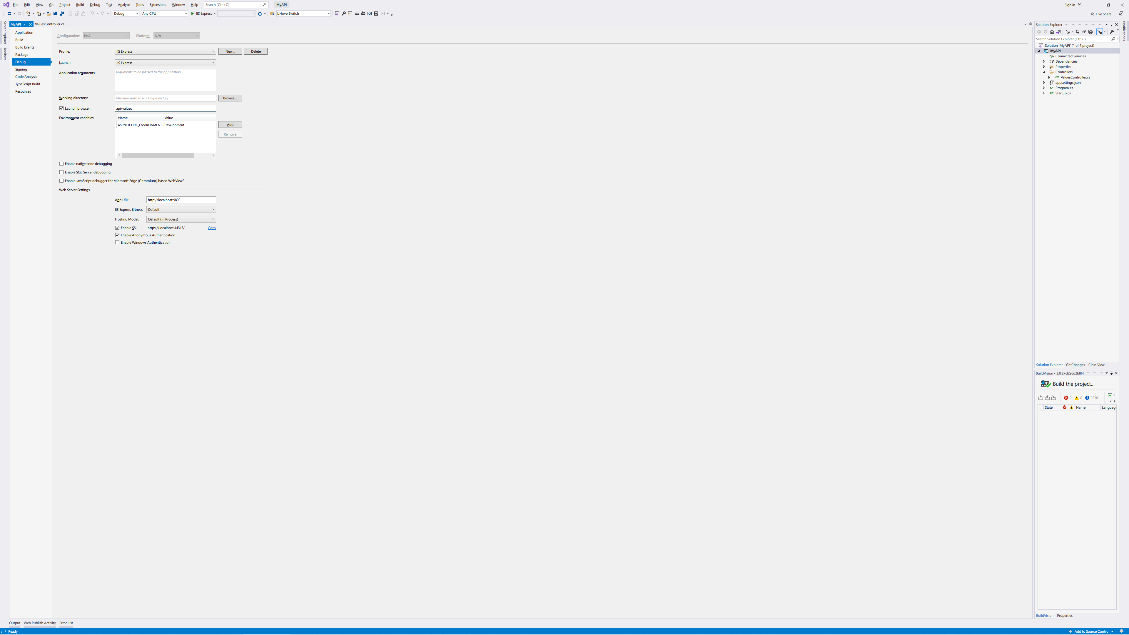 오른쪽 프로젝트에서 마우스 오른쪽 버튼을 눌러 'Properties (속성)'메뉴로 들어갑니다. 속성 화면에서 Debug 항목을 눌러 Launch browser 항목을 찾아 weatherforecast로 되어 있는걸 'api/values'로 바꿔줍니다.