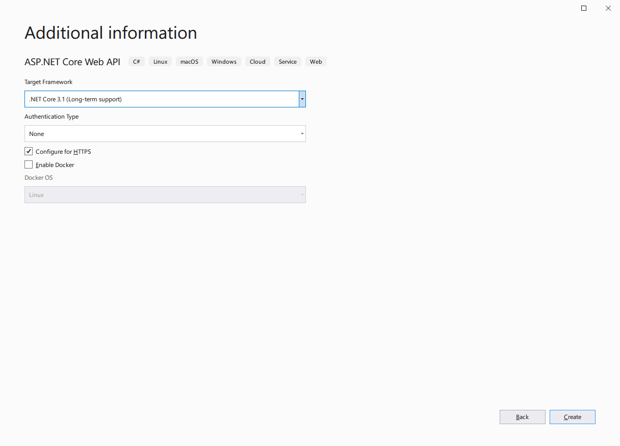 버전은 Core 3.1로 하며 Authentication Type은 'None'으로 설정합니다.