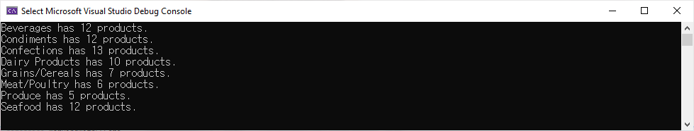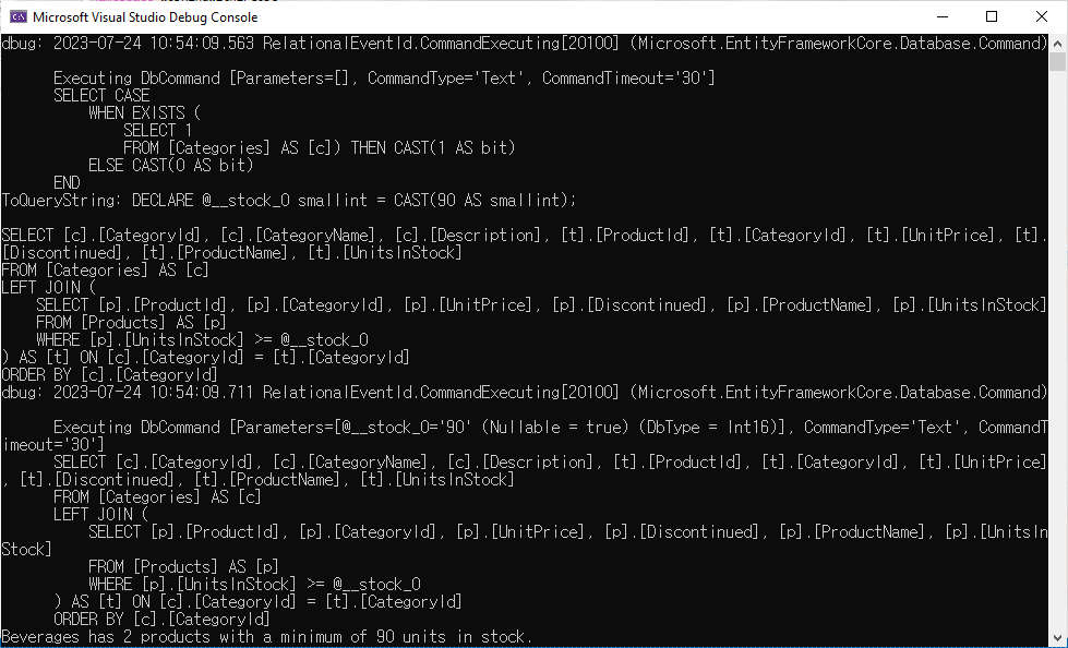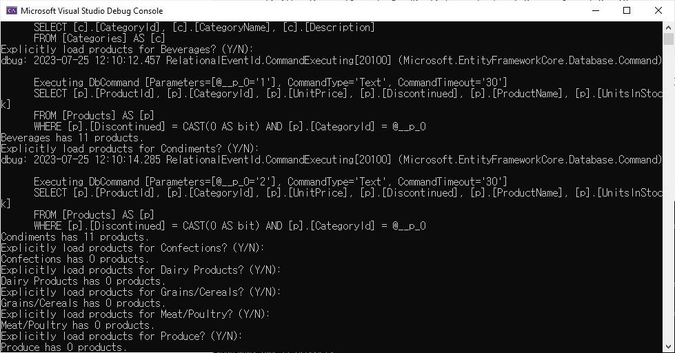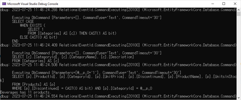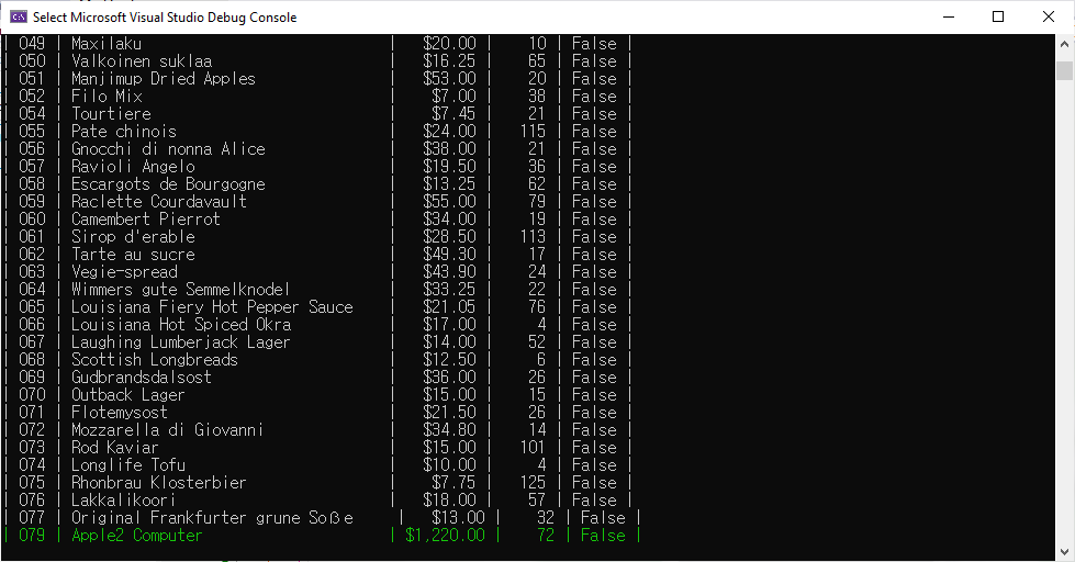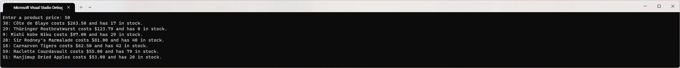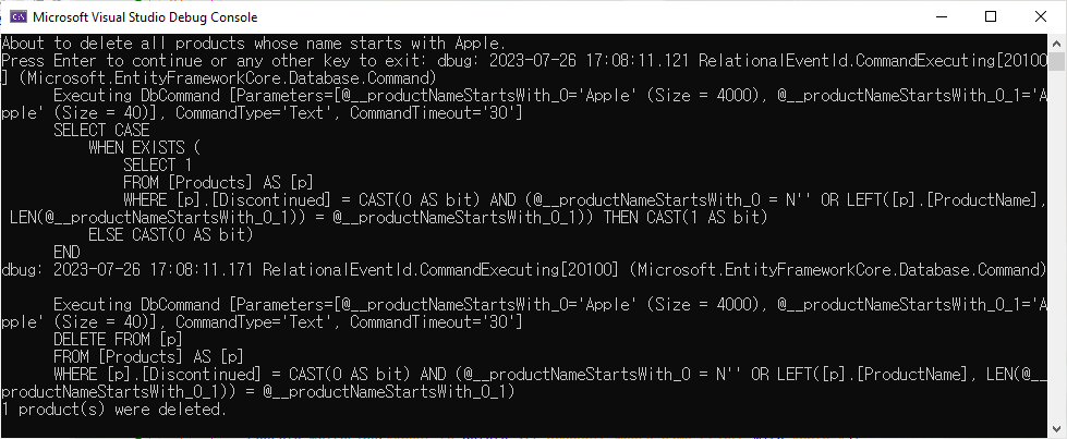 Program.cs에서 DeleteProductsBetter method를 호출하도록 하고 예제를 실행하면 다음과 같은 결과를 표시할 것입니다.
