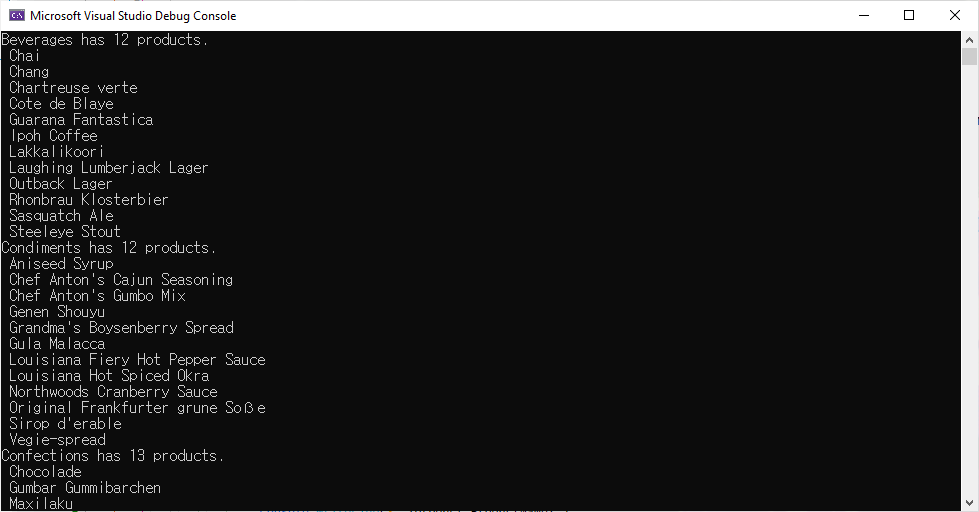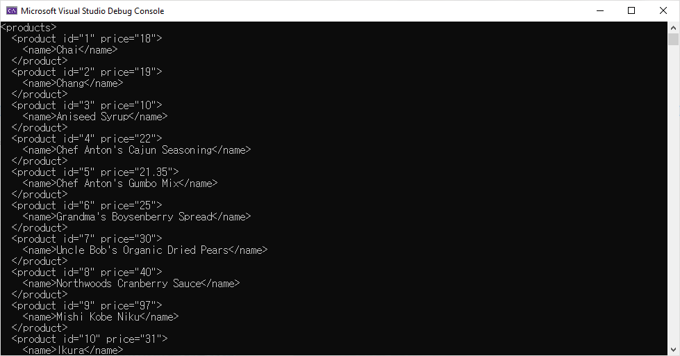 Program.cs에서 OutputProductsAsXml method를 호출하도록 한 뒤 예제를 실행하면 다음과 같은 결과를 표시할 것입니다.