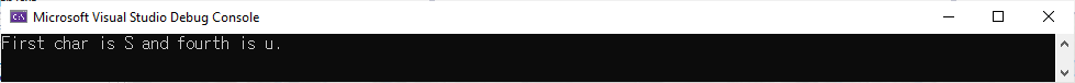 Console.WriteLine($"First char is {city[0]} and fourth is {city[3]}.");