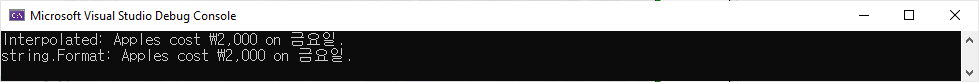 Console.WriteLine($"{c1} added to {c2} is {c3}");