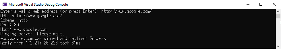 그리고 Program.cs에서 사용자에게 website주소의 입력을 요청하고 주소가 입력되면 Uri type을 사용해 해당 주소를 HTTP, FTP 등의 scheme, port 번호, host 등 각각의 요소로 분해하는 문을 아래와 같이 추가합니다.