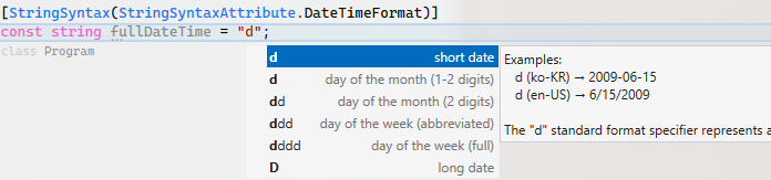 Program.cs에서 string변수의 첫 번째 문자와 네 번째 문자를 표시하는 문을 아래와 같이 작성합니다.