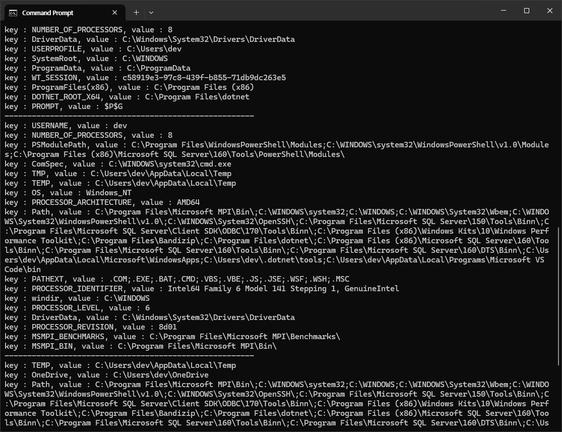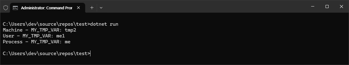 예제를 통해 다양한 범위 수준에서 현재 환경변수를 어떻게 확인할 수 있는지 확인해 보겠습니다. Program.cs를 아래와 같이 작성합니다.