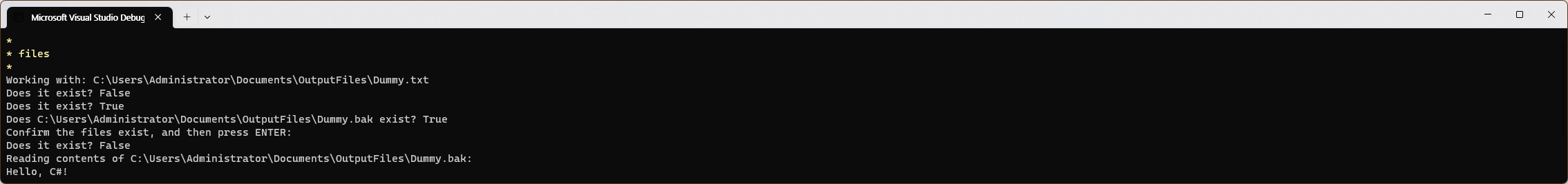 Console.WriteLine($"Does it exist? {File.Exists(textFile)}");