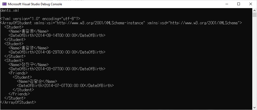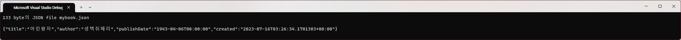 생성된 JSON file은 총 171byte로 member의 이름은 publishDate와 같이 camelCase가 적용되었습니다. 이는 Javascript를 사용하는 browser를 위한 가장 적합한 방식입니다. 또한 option설정에서 pages를 포함하여 모든 field를 포함하도록 했고 결과를 보면 사람이 읽기 쉽도록 하기 위해 JSON자체에 들여 쓰기 등의 서식이 적용되어 있음을 확인할 수 있습니다. DateTime와 DateTimeOffset값은 단일 표준 문자열 값으로 저장됩니다.