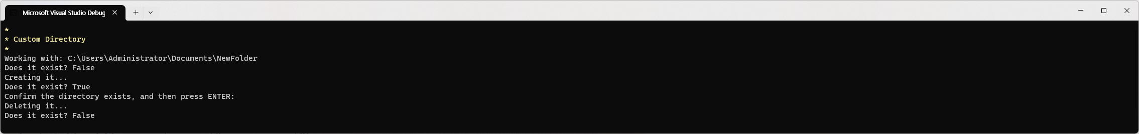 Console.WriteLine($"Does it exist? {Path.Exists(newFolder)}");