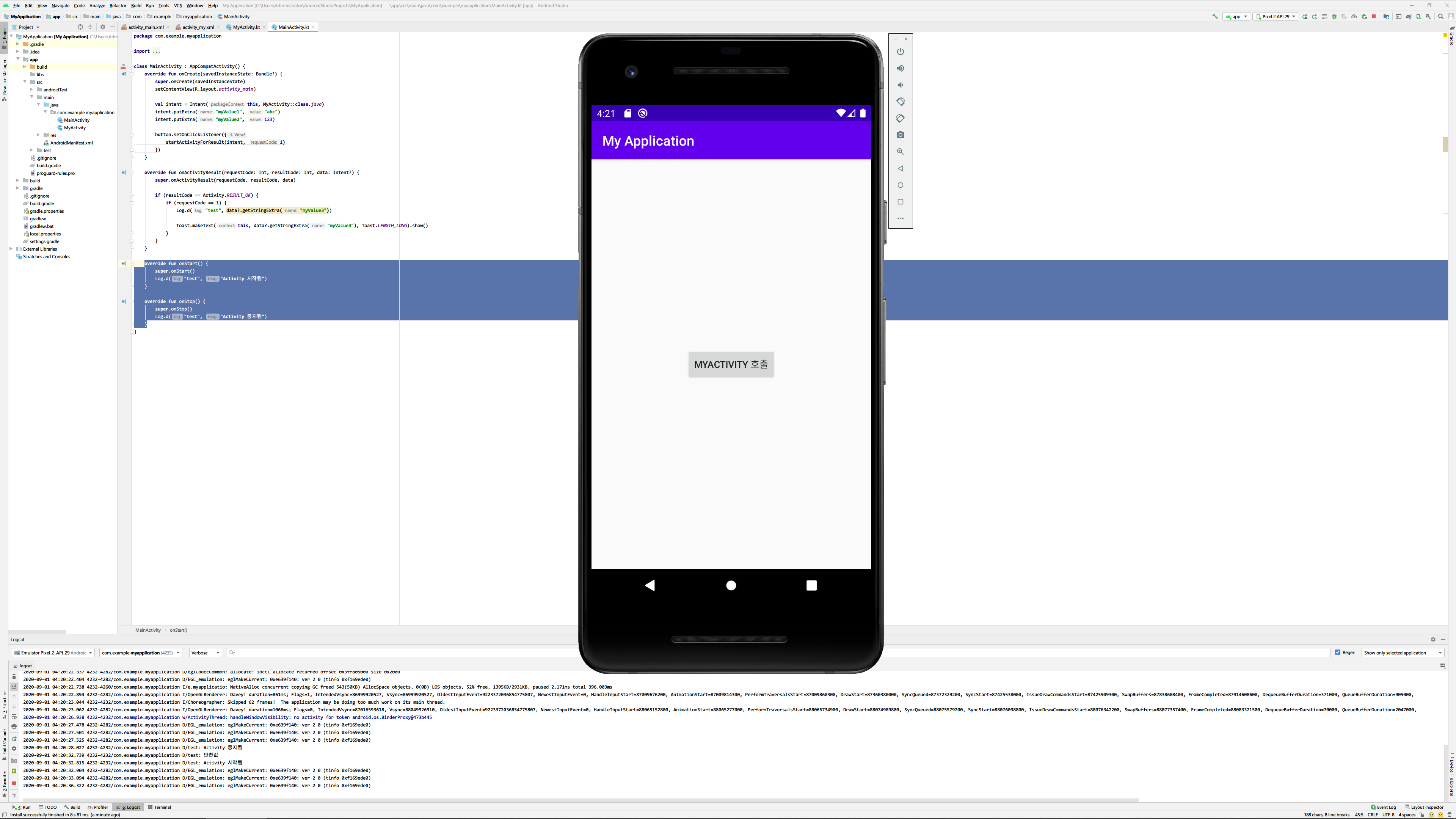 위 코드를 조금전 새롭게 추가한 MyActivity의 onCreate 메서드 안에 작성합니다. intent자체는 이미 Activity가 호출될 때 전달되는 것이므로 별다른 선언 없이 곧장 사용할 수 있으며 getStringExtra함수를 통해 문자열 형태의 값을 받도록 합니다.