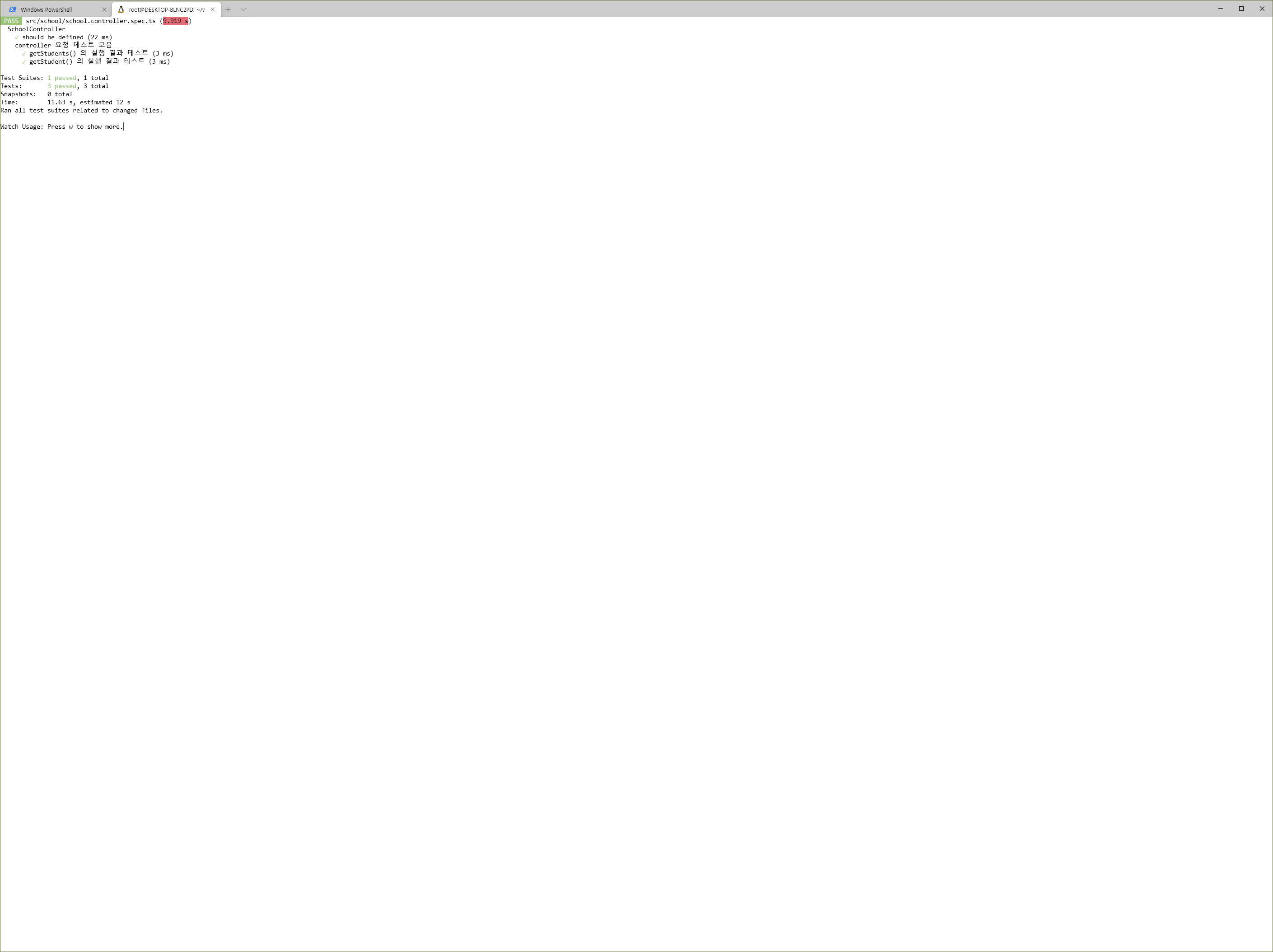 위에서 테스트를 시작할때 test:warch모드로 실행했기 때문에 파일이 수정되면 즉시 테스트가 진행될 것입니다.