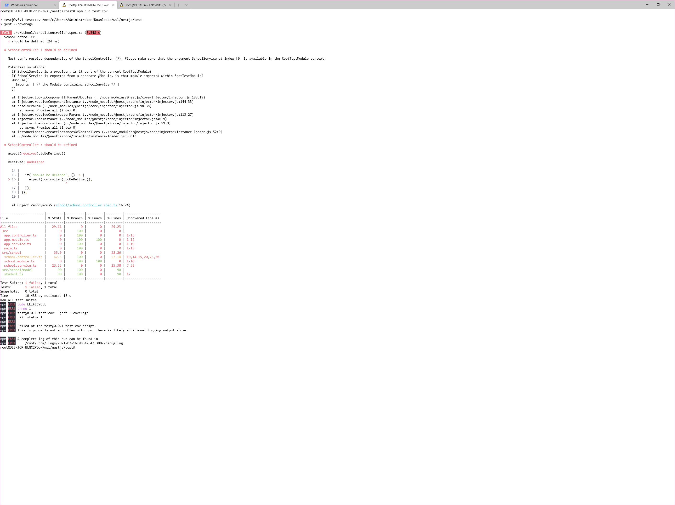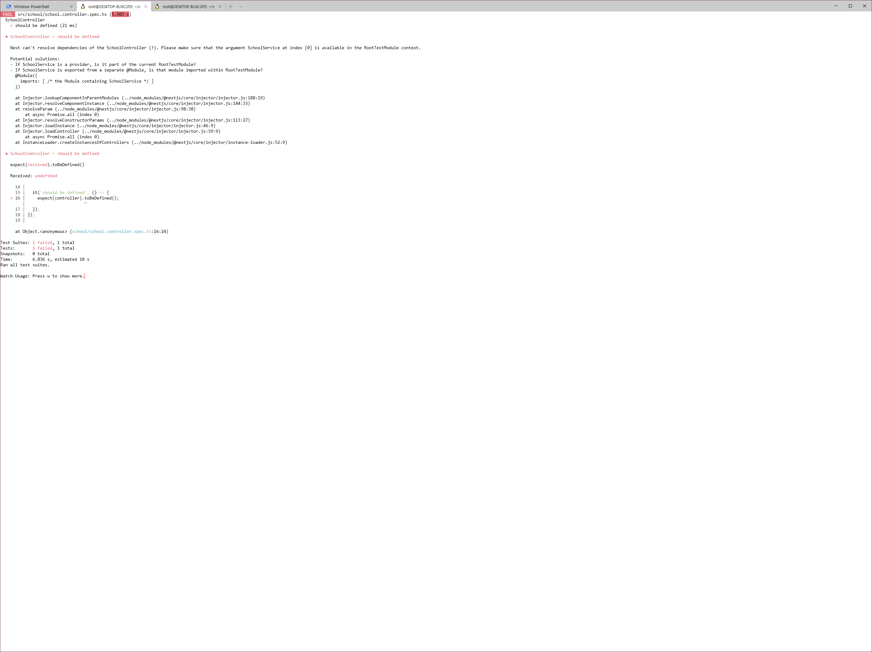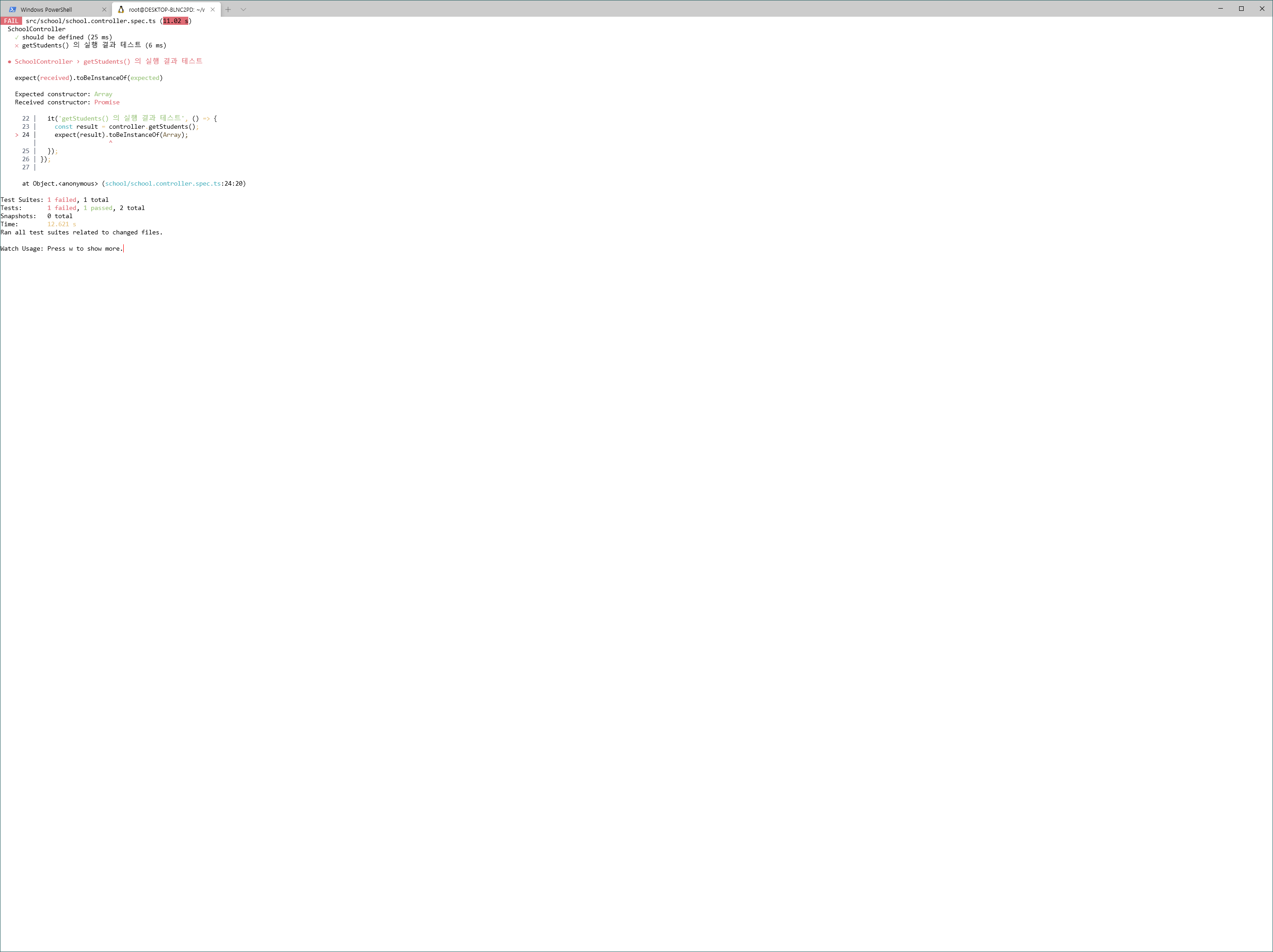 예제에서는 school.controller.spec.ts 하나만 남겨놓고 진행한 것인데 총 1개의 파일 중 1개의 파일 테스트가 실패했음을 알려주고 있습니다.