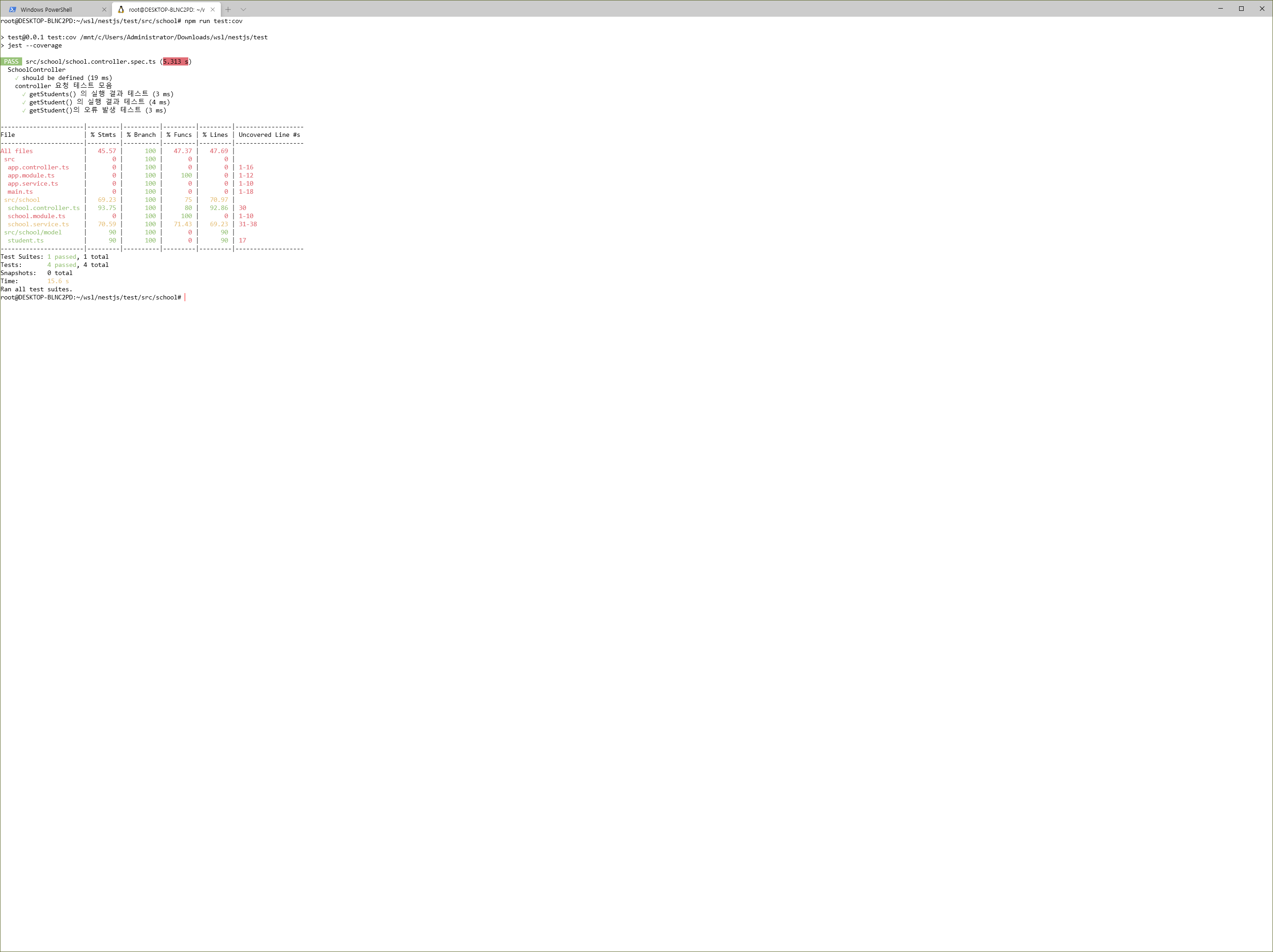아래 화면에서는 school.controller.ts의 테스트가 아직 80% 정도밖에 이루어지지 않았다고 표시하고 있습니다.